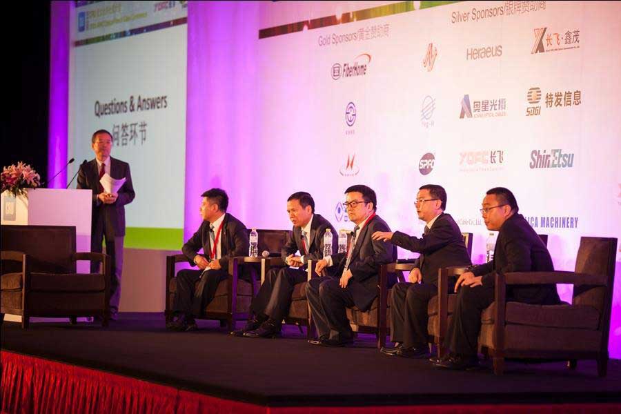 茶歇过后,是中国光纤光缆行业高层对话的圆桌会议,发言人有长飞公司总裁庄丹、烽火公司总裁戈俊、亨通公司执行总裁钱建林、中天科技总裁薛驰及富通集团总裁肖玮。